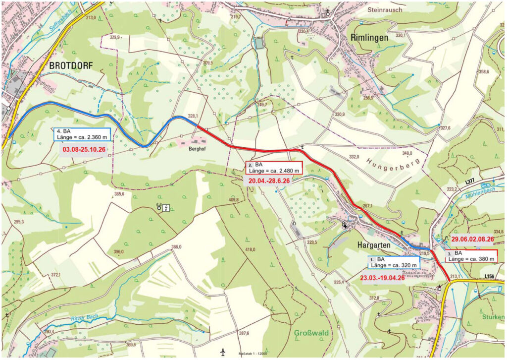Betroffen ist der Bereich ab der Einmündung L 156 außerorts von Hargarten („Hargarter Kehr“) bis nach Brotdorf zur Einmündung L 157 auf einer Länge von insgesamt ca. 5.540 Metern.