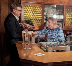2) Bürgermeister Thomas Collmann überreicht der langjährigen Wirtin Gertrud Urhahn  einen Blumenstrauß