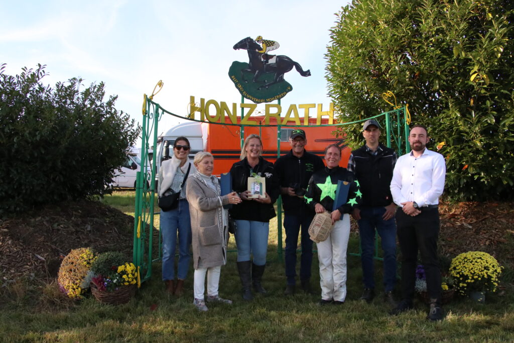 Siegerehrung zum Ehemaligenrennen, geritten von ehemaligen lizenzierten Berufsrennreitern/innen oder Amateurreitern/innen, dem Preis der Gemeinde Beckingen. Lokalmatadorin Eva Maria Herresthal siegte in diesem Ausgleich IV über 1800 Meter mit Little Sam, trainiert von Frank Mauer für den Rennstall Schwarzer Maurer. Die Siegpreise wurden von Thomas Schwinn (jun.), 1. Vorsitzender des RRV Honzrath , Fabienne Gratz (1. Geschäftsführerin RRV Honzrath) und dem Ersten Beigeordneten der Gemeinde Beckingen, Marvin Bimperling übergeben.