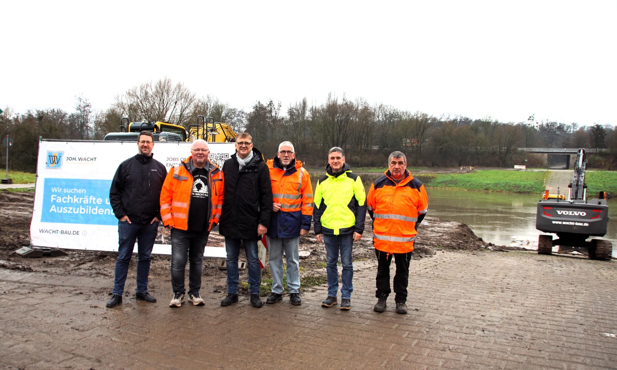 1) Ortstermin zu Beginn der Asphaltierungsarbeiten für das erste Teilstück des neuen Radweges. Auf dem Foto (von links) Thorsten Nicola vom Kulturamt der Gemeinde, Bauleiter Horst Voeste von der Bauunternehmung Johann Wacht, Bürgermeister Thomas Collmann, Geschäftsführer Thomas Thiel vom Ingenieurbüro IBZ, Gemeindebauingenieur Martin Speicher und Polier Michael Grancheo von der Bauunternehmung.
