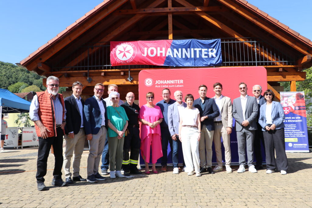Gruppenfoto mit Leonard Frisch (Regionalvorstand Saar, 4.v.r) und vielen weiteren offiziellen Gäste, darunter Timm Mathis (Geschäftsführer ZRF), Oliver Meermann (Landesvorstand HRS Johanniter), Richard Seitz (Bereichsleiter Einsatzdienste HRS Johanniter), Thomas Frisch (Geschäftsführer Ambulanz Frisch), Hendrik Schwab (Standortleiter), Daniela Schlegel-Friedrich (Landrätin des Landkreises Merzig-Wadern), Hubert Schwinn (Ortsteher von Erbringen), Astrid Moritz (Stellvertretende Ortsvorsteherin), Werner Folz (Löschbezirksführer der Feuerwehr Erbringen), Vertreter weitere Hilfsorganisationen sowie MdB Esra Limbacher (Ehrenamtlicher Vorstand bei den Johannitern) und MdL Sebastian Schmitt. Es fehlt Bürgermeister Thomas Collmann.