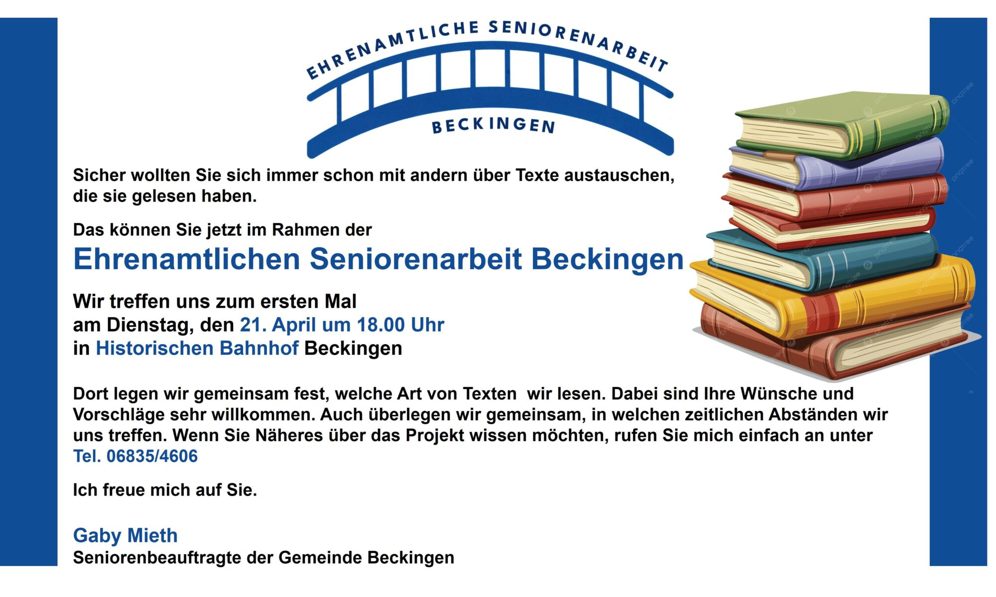 Ehrenamtliche Seniorenarbeit Beckingen – Treffpunkt für Leseinteressierte, 1. Termin Dienstag, 21. April 2026, 18.00 Uhr, im Historischen Bahnhof Beckingen.